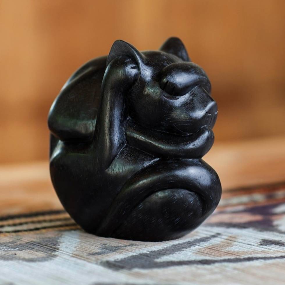 Artisan Crafted Wood Sculpture 'Black Yogi Cat' Item ID: 2671702546