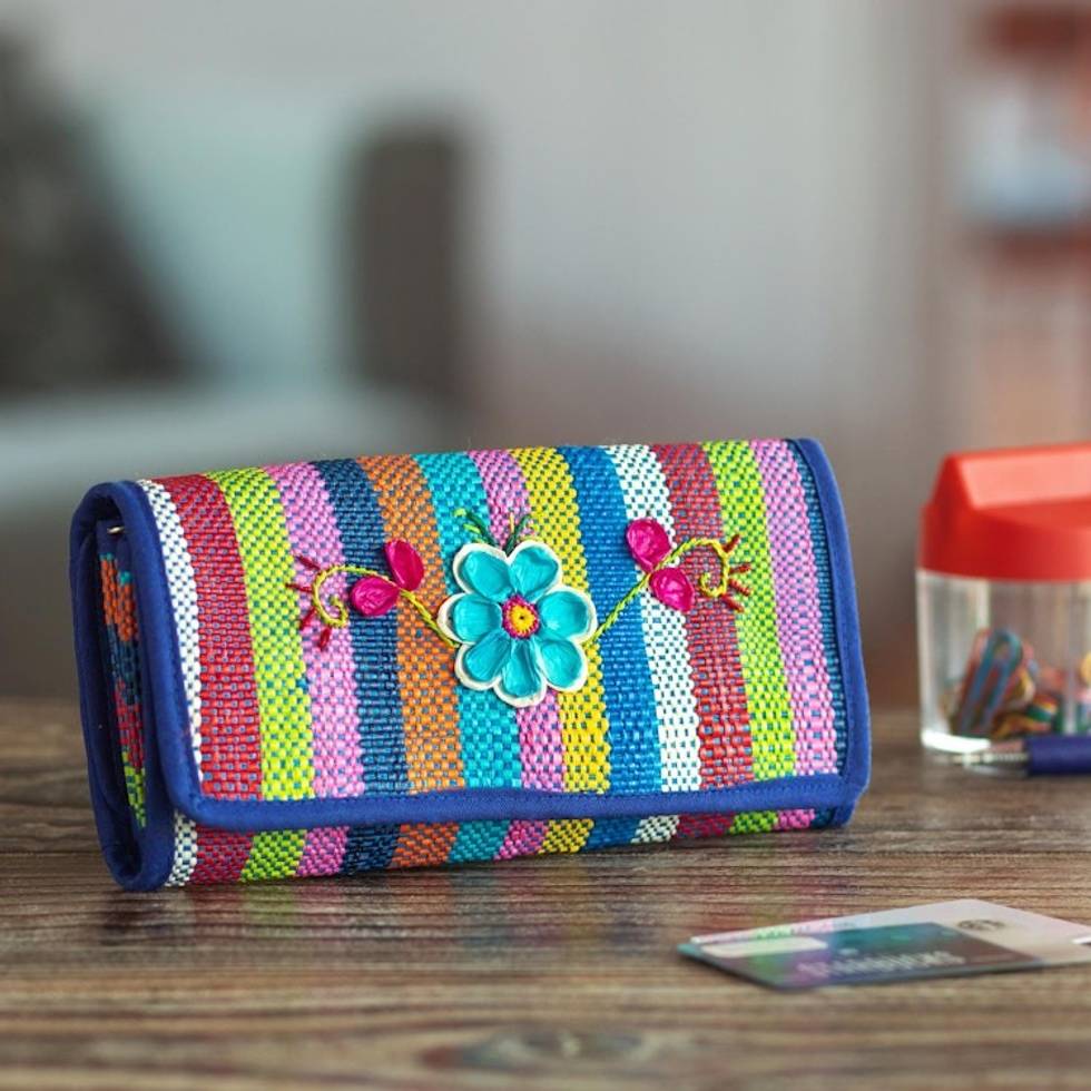 Artisan Crafted Woven Palm Fiber Wallet 'Northern Flowers in Blue' Item ID: 2671224230