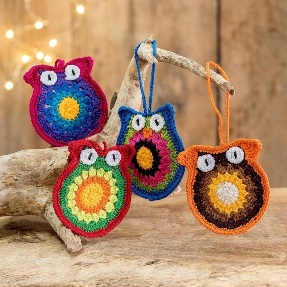 Artisan Hand-Crocheted Ornaments set of 4 'Festive Owls' Item ID: 2671771791