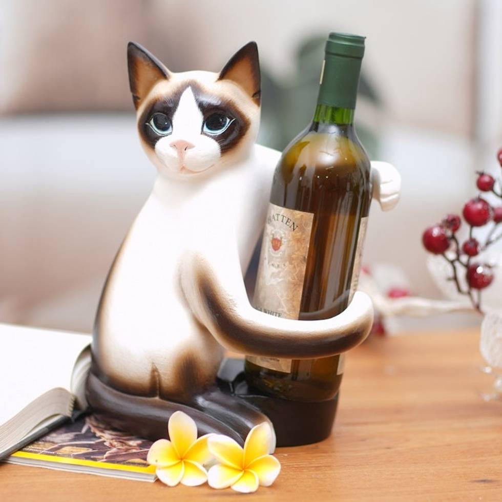 Artisan Handcrafted Wood Cat Wine Holder from Bali 'Cat Hug' Item ID: 2671734716