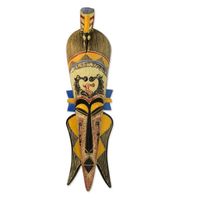 I was immediately attracted to the colors of this mask. They match my sofa and the painting hanging over it perfectly. And of course the expression of the mask is captivating. Sort of a sad face, but also a peaceful face. Love it!Superb crafting and imagination.Marsha