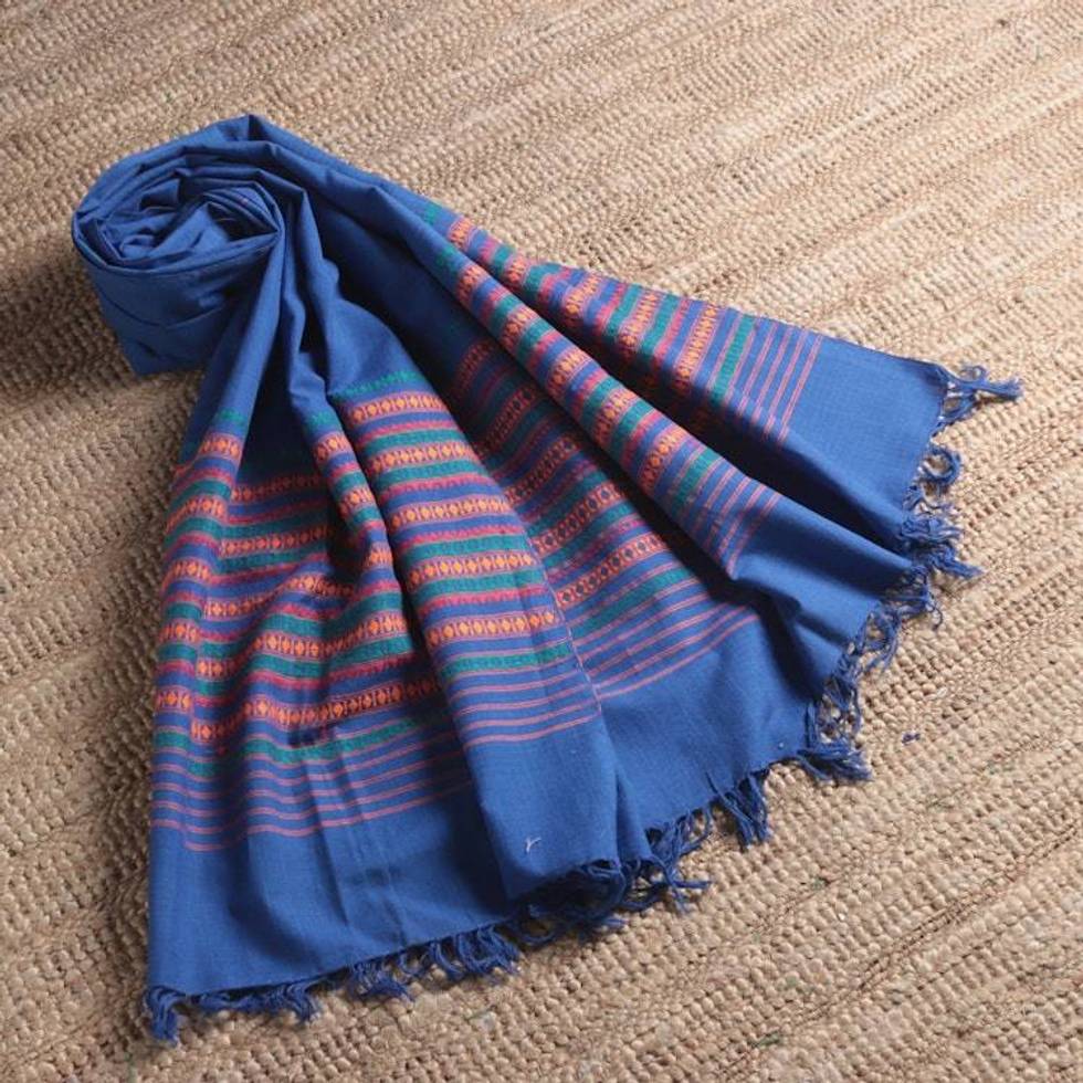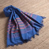 Artisan-Made 100 Cotton Fringed Shawl in Sapphire Blue Hues 'Sapphire Ways' Item ID: 2676666270