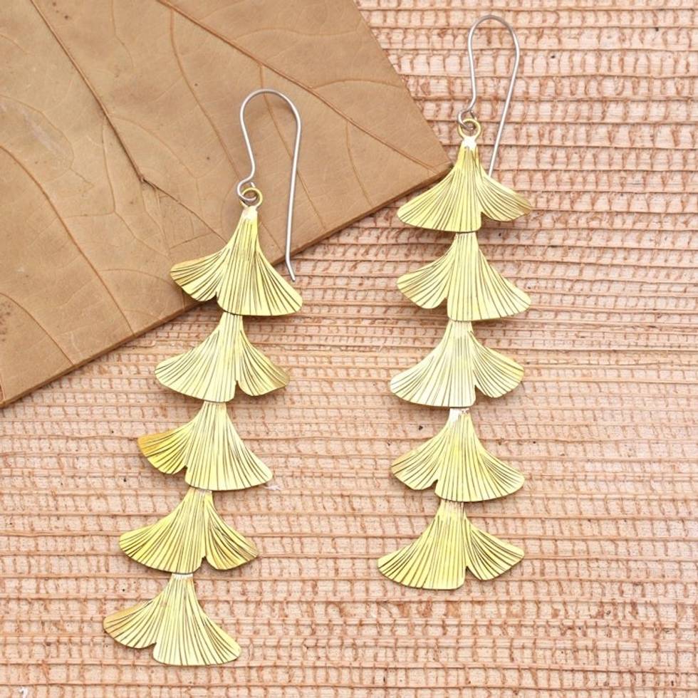 "Shimmering golden fan shapes cascade from stainless steel hooks in Agus Suryanto's lovely dangle earrings. Crafted of shining brass with hand-etched motifs, the dramatic pair measures some four inches long."