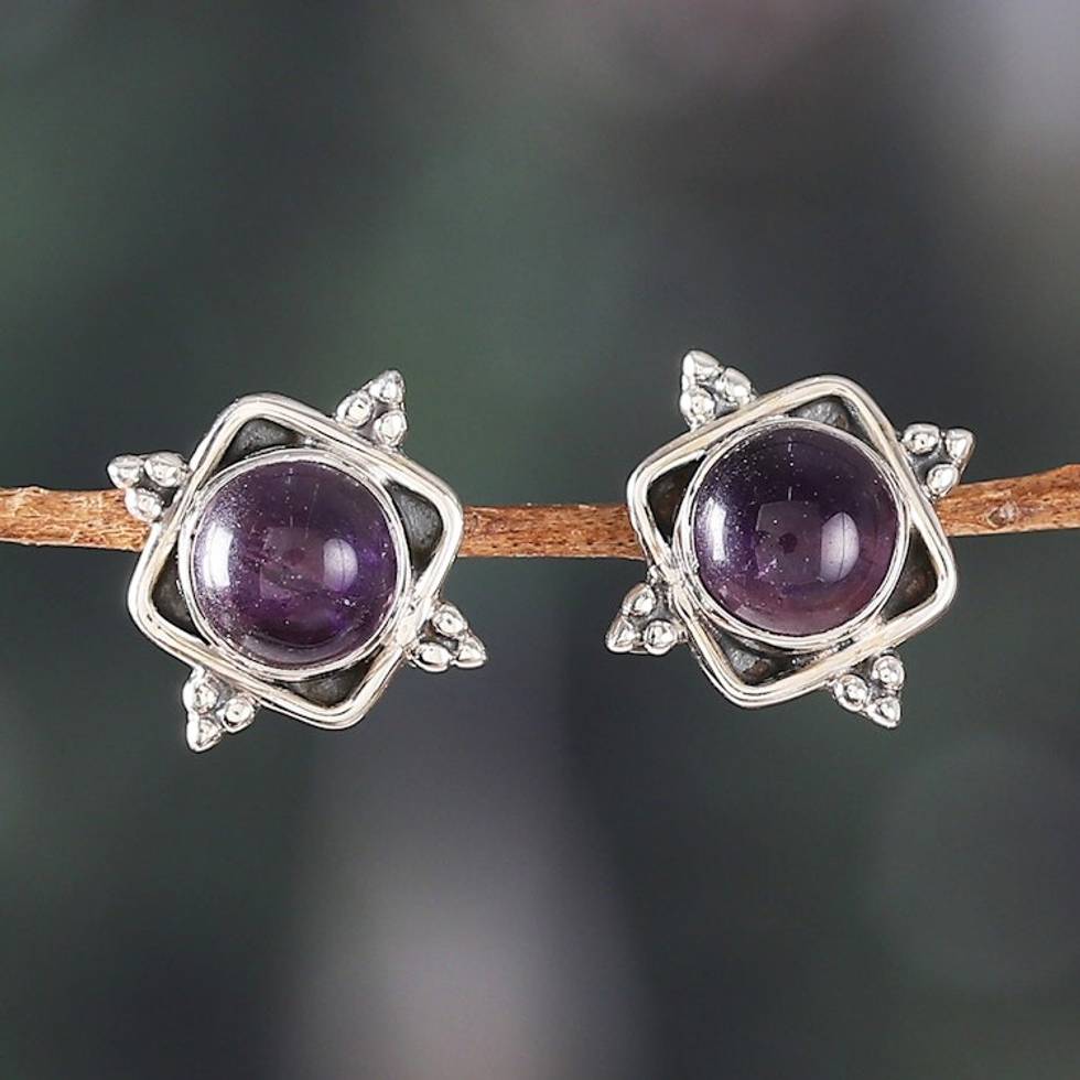 Artisan-Made Amethyst Cabochon Button Earrings from India 'Sapience Marchioness' Item ID: 2671623523
