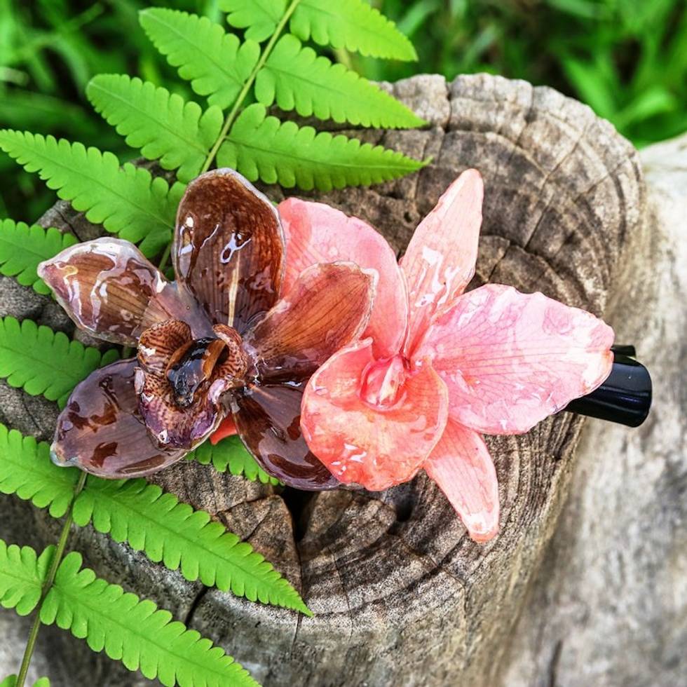 A friend who ADORES Orchids refuses to believe that this artist uses real Orchids as a base for his art. The colors are exquisite and the quality superb. This hair clip is not overly fragile and a quite unique accent piece to any outfit.