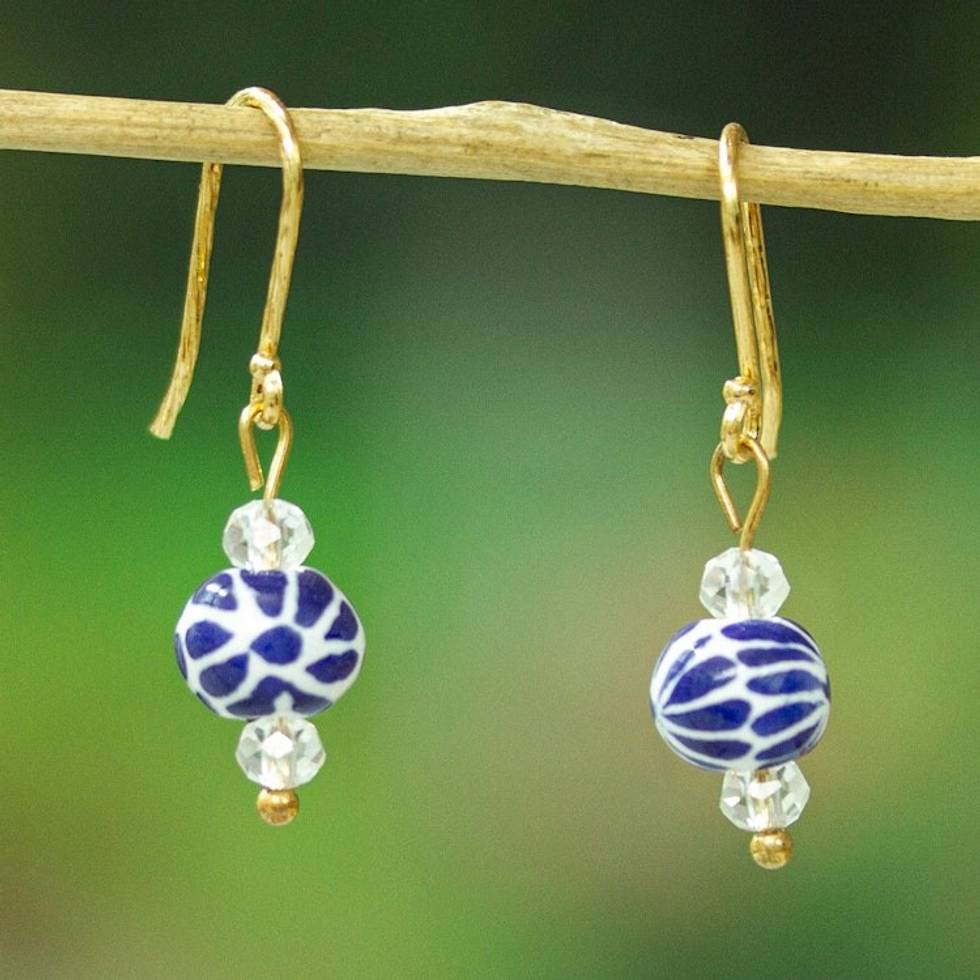 Artisan-Made Talavera-Themed Gold-Accented Dangle Earrings 'Talavera Sparks' Item ID: 2671798556
