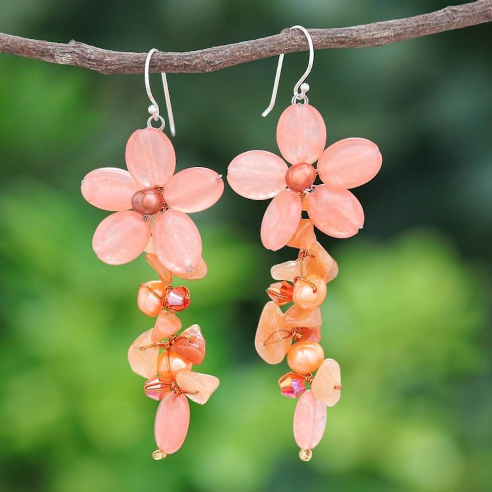 Aventurine and Cultured Pearl Floral Earrings 'Petal Passion in Orange' Item ID: 2669926057