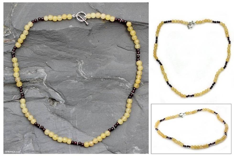 I love this garnet necklace and it is a very unique piece. I can wear it with casual clothes and with my professional clothes. I get many compliments when I wear it.