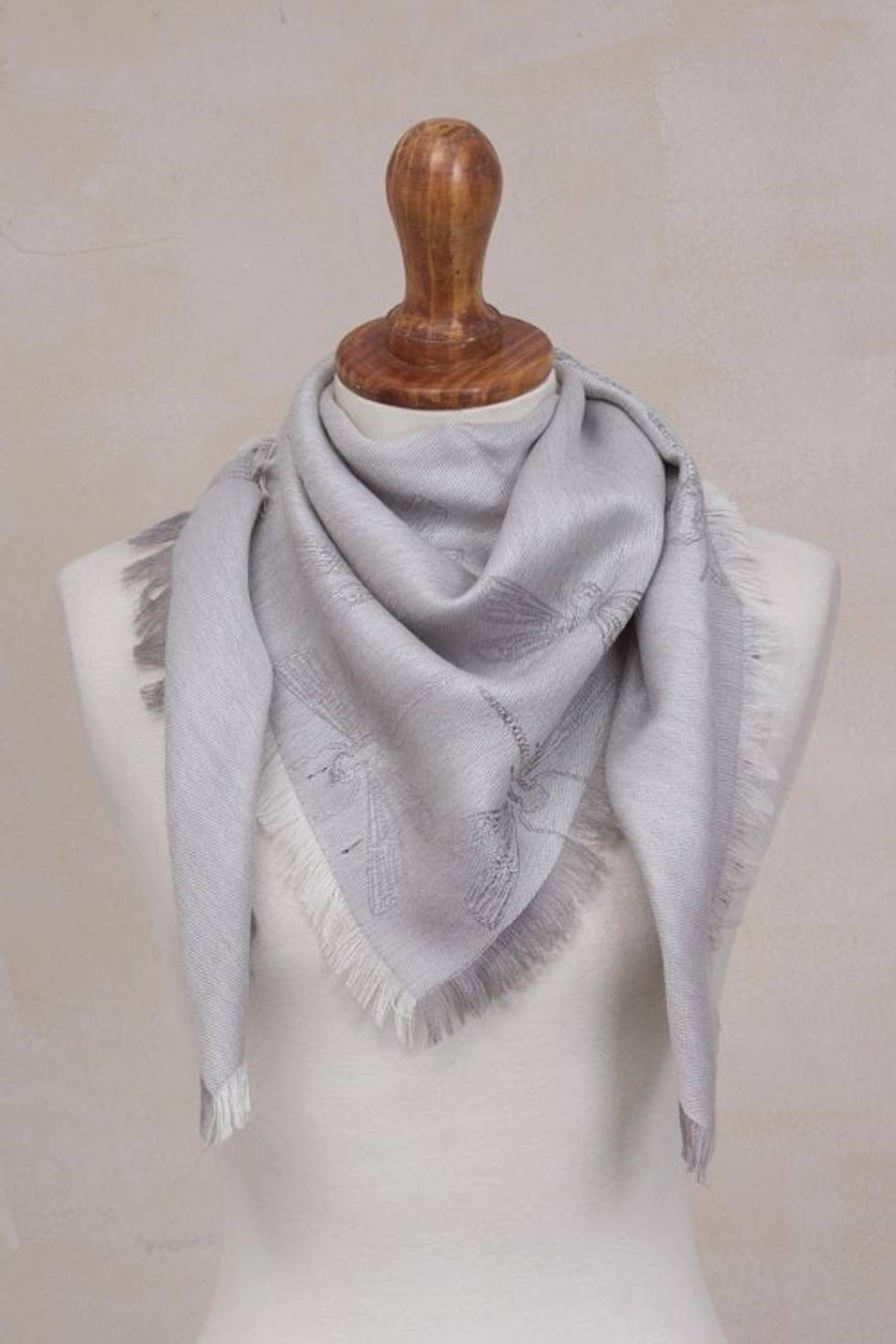 Baby Alpaca and Silk Blend Grey Dragonfly Reversible Scarf 'Dragonfly in Pearl Grey' Item ID: 2671820355