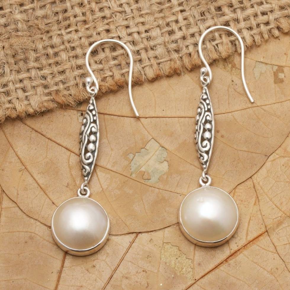 Bali Cultured Mabe Pearl and Sterling Silver Dangle Earrings 'Moon's Bliss' Item ID: 2671702471