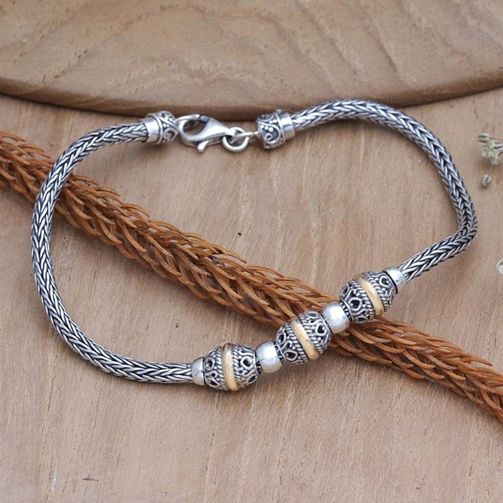 Balinese 18k Gold-Accented Sterling Silver Pendant Bracelet 'Cylindrical Charm' Item ID: 2671670889