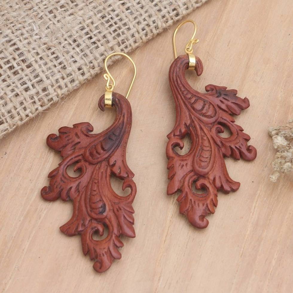 "Indonesian artisan Kuera Putra hand-carves this pair of striking dangle earrings perfect for those who love an artistic touch in their fashion accessories. The earrings are crafted from local sawo wood and feature 18k gold-plated brass hooks."