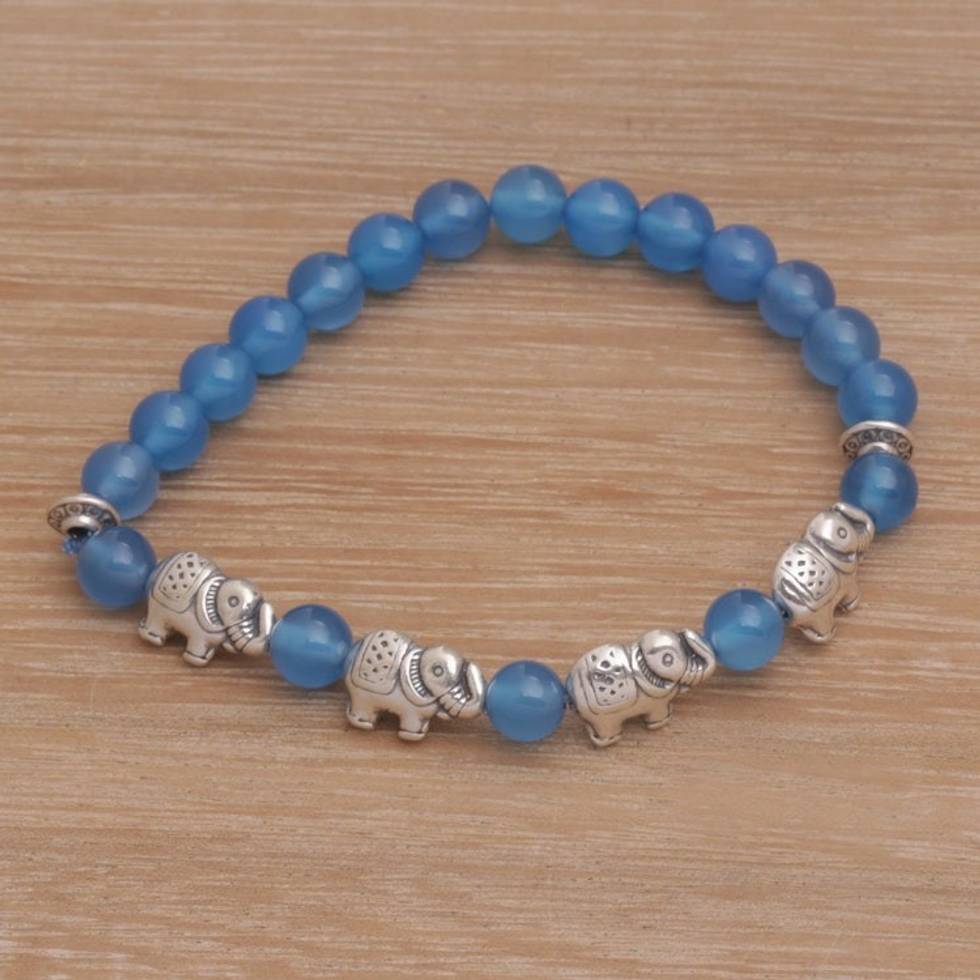 Balinese Agate and Sterling Silver Beaded Stretch Bracelet 'Elephant Cavalcade in Blue' Item ID: 2671482585
