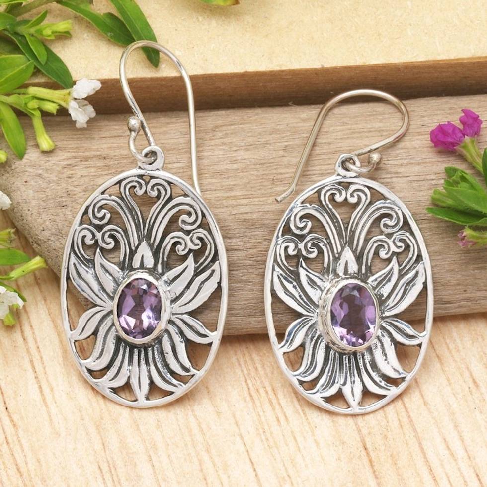Balinese Amethyst and Sterling Silver Lotus Dangle Earrings 'Daylight Lotus' Item ID: 2671734749