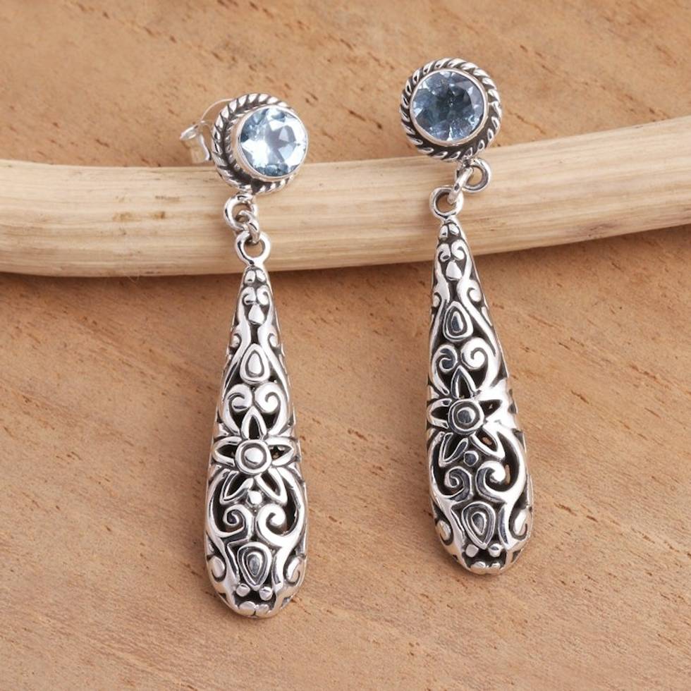 Balinese Blue Topaz and Sterling Silver Earrings 'Flower Pendulum' Item ID: 2669920991