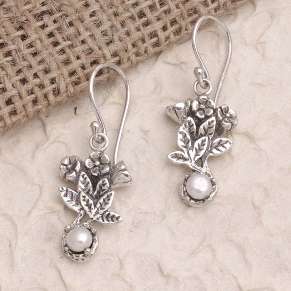 Balinese Cultured Pearl Sterling Silver Leaf Dangle Earrings 'Leaf Clarity' Item ID: 2671747787
