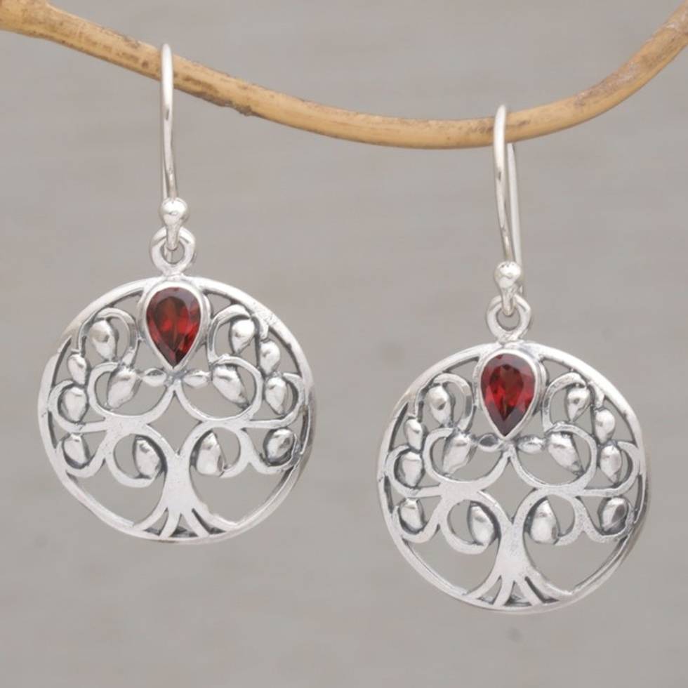 Balinese Garnet and Sterling Silver Tree Dangle Earrings 'Banyan Beauty' Item ID: 2671734547