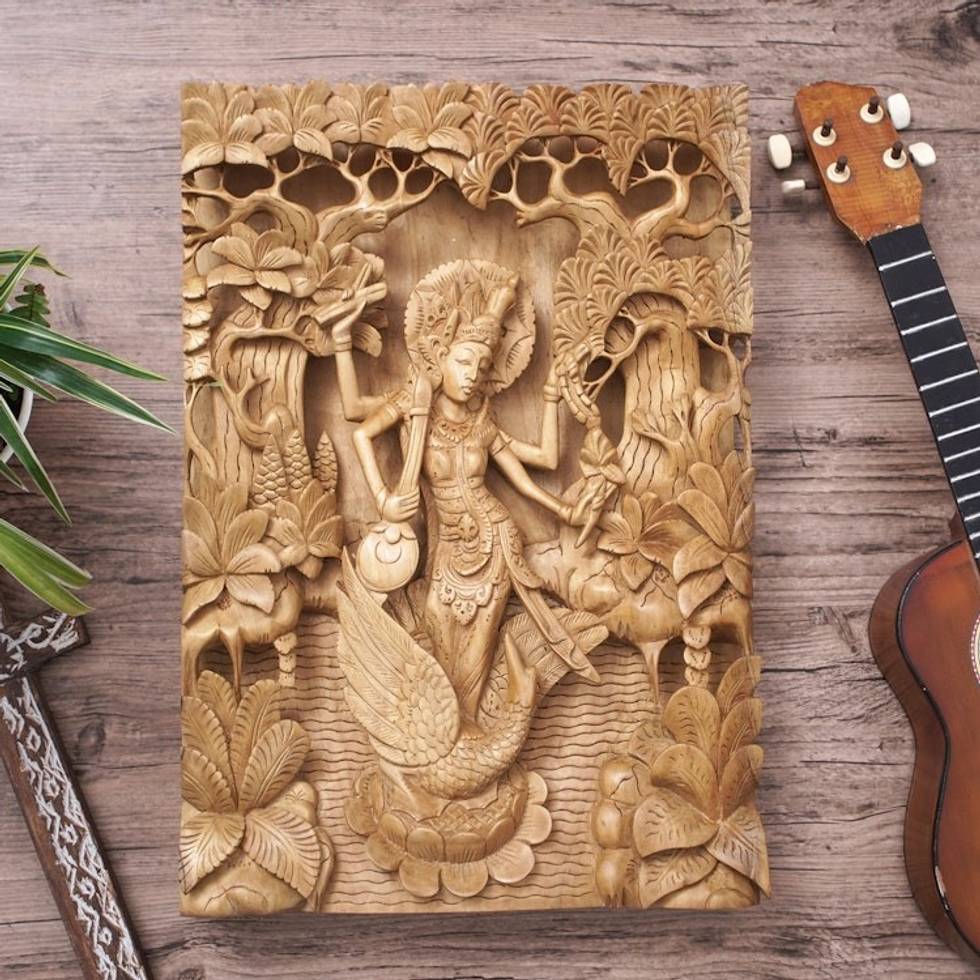 Balinese Hand Carved Relief Panel of the Goddess Saraswati 'Hindu Goddess Saraswati' Item ID: 2671702517