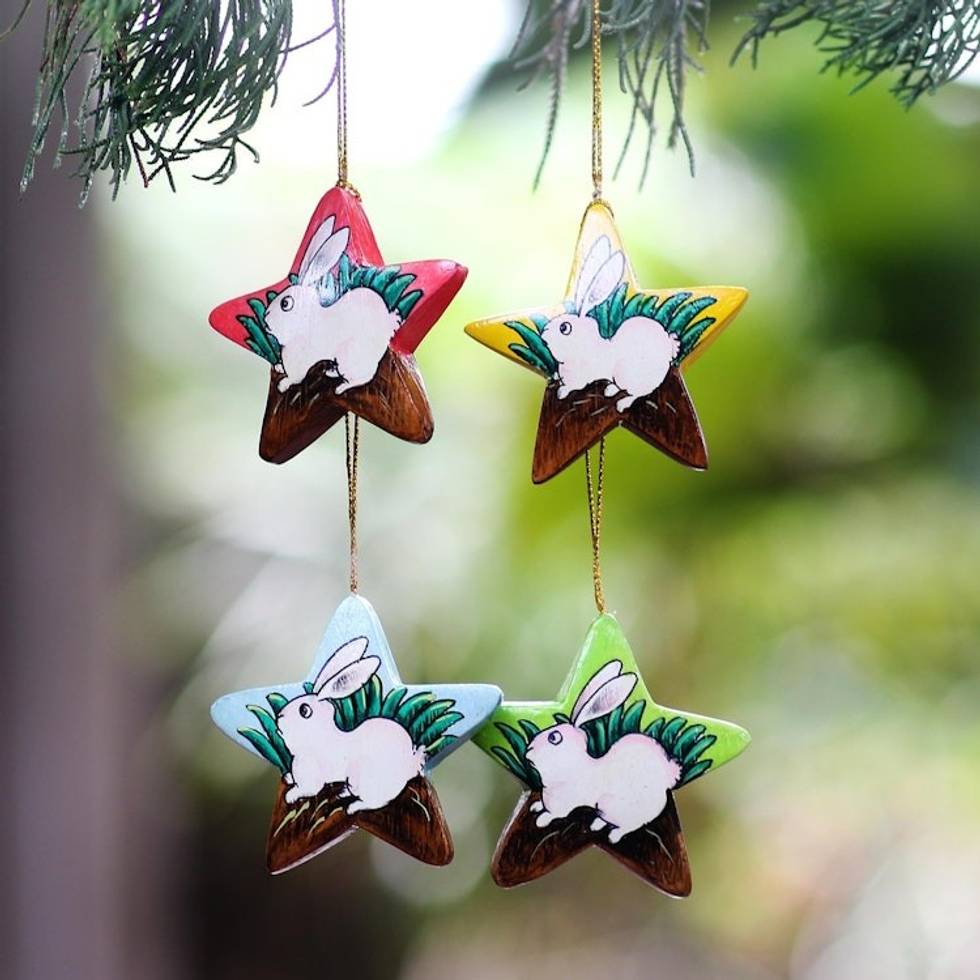 Balinese Hand Painted Bunny Rabbit Star Ornaments Set of 4 'White Island Bunnies' Item ID: 2671732654