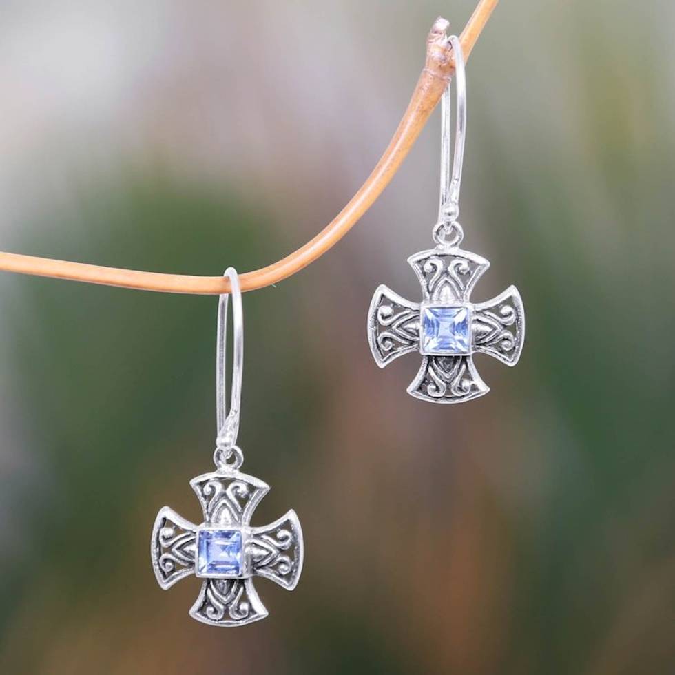 Balinese Handcrafted Silver and Blue Topaz Cross Earrings 'Cross Pattee' Item ID: 2669921297