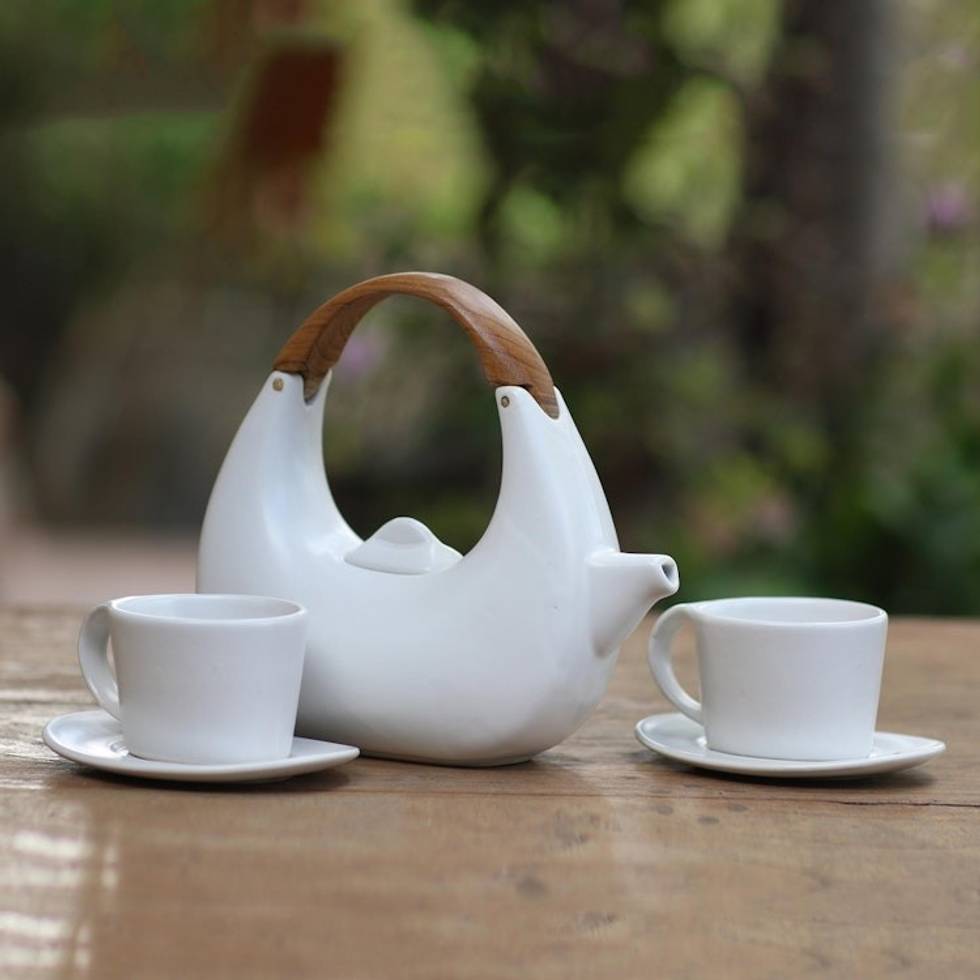 Balinese Matte White Ceramic Tea Set with Teak Handle 'Resting Cloud in White' Item ID: 2671744789