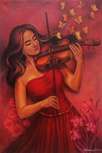 Balinese Realist Painting of Violinist in Red Dress 'Peace of Symphony' Item ID: 2669889247