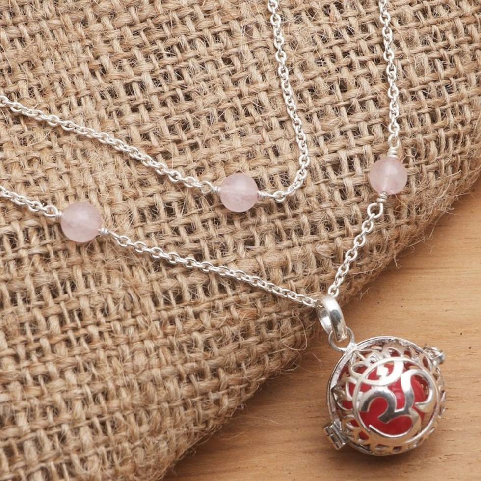 Balinese Silver and Rose Quartz Harmony Ball Necklace 'Sweet Omkara' Item ID: 2671477956