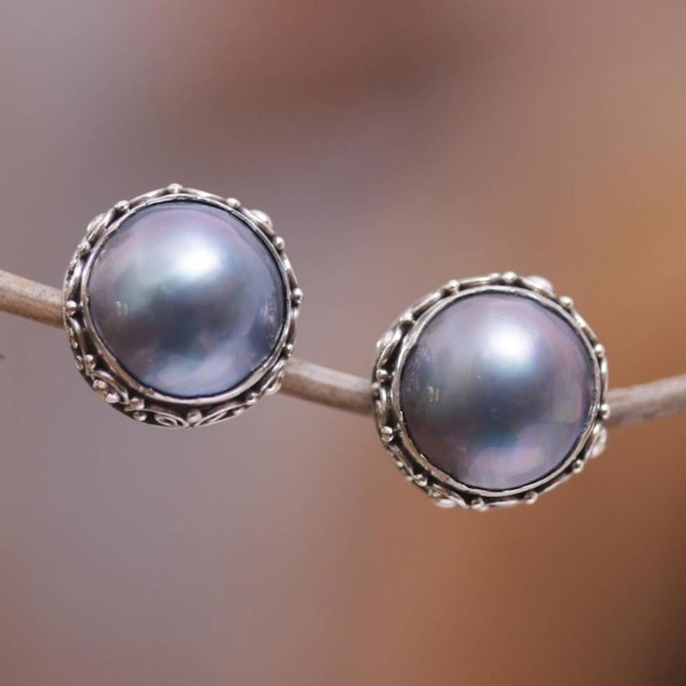 Balinese Sterling Silver Button Earrings with Blue Pearls 'Blue Pearl Trophy' Item ID: 2669920801