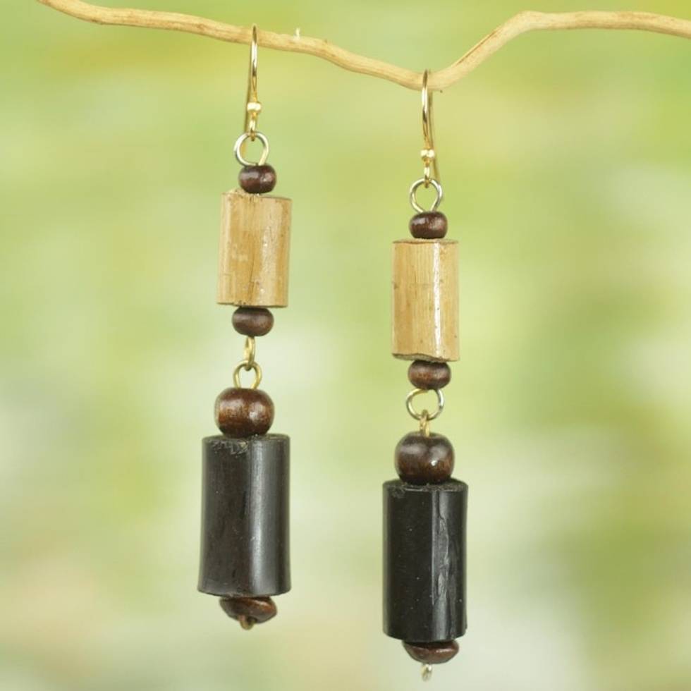 Bamboo and Sese Wood Dangle Earrings Brass Hooks from Ghana 'African Homestead' Item ID: 2671803872