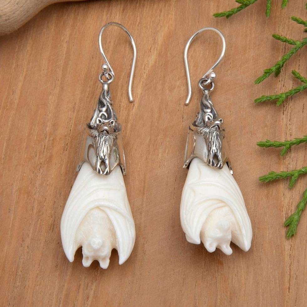 Bat-Themed Sterling Silver Dangle Earrings in White 'Angel Bat' Item ID: 2671556337