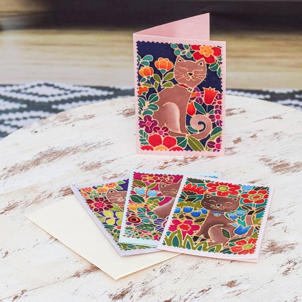 Batik Cotton and Paper Cat Greeting Cards Set of 4 'Blooming Felines' Item ID: 2671641107