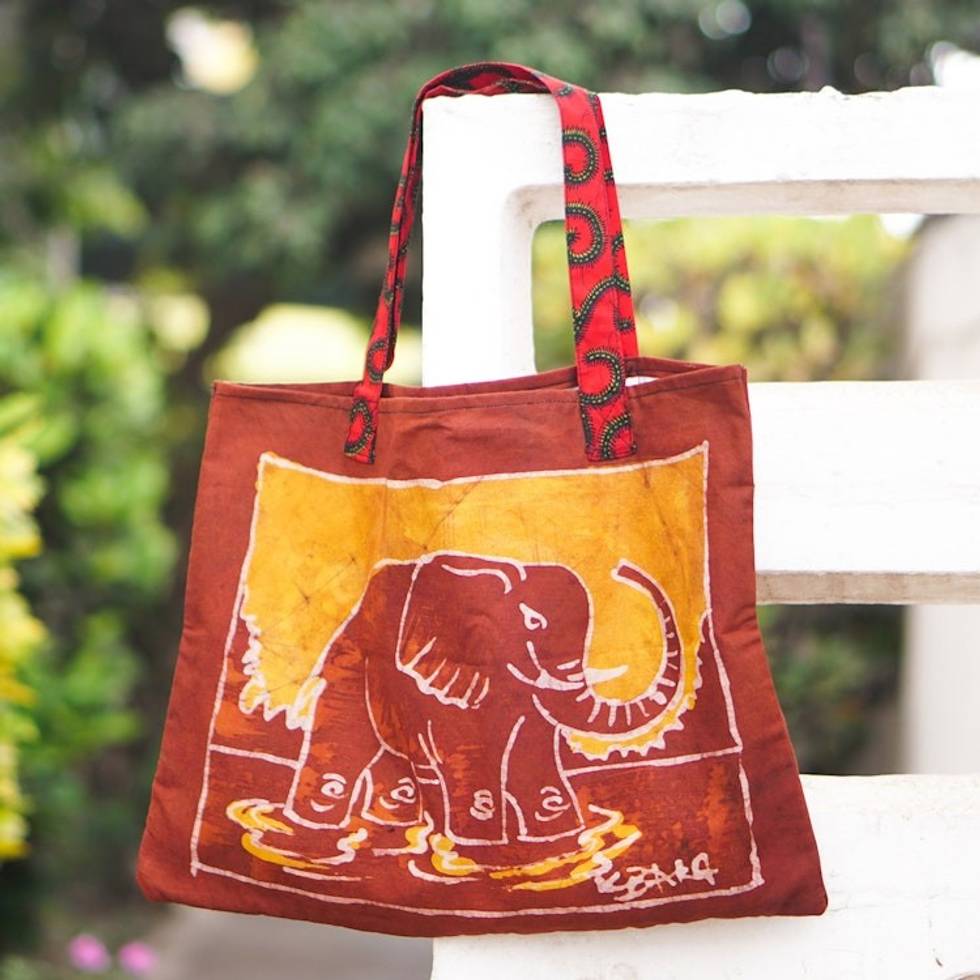 Batik Cotton Elephant Tote Bag from Ghana 'Elephant at the Market' Item ID: 2671800786