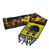"Crafted in bright yellow, K. Baka's colorful scarf is one accessory you'll want to wear all winter long. On 100% cotton fabric, the artisan uses batik dyeing methods to create a baby elephant motif in yellow, brown, and blue. A row of fringe on either end adds a playful element."