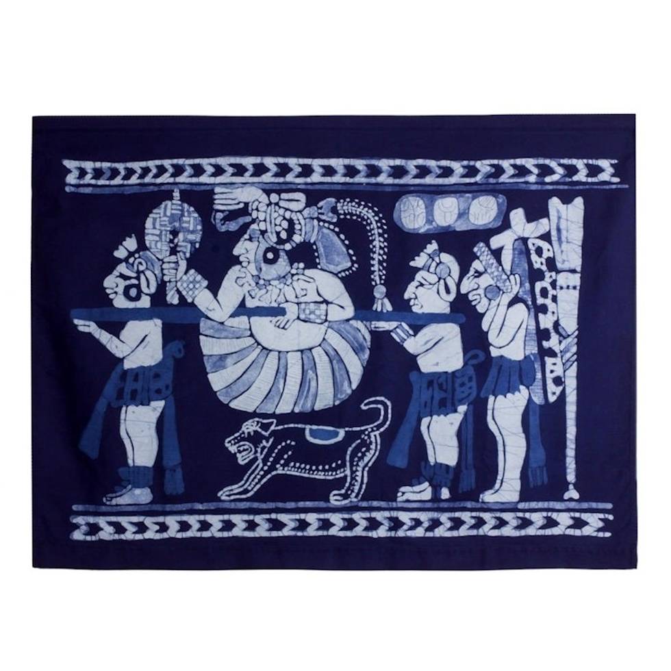 "During the times when European explorers began arriving on the shores of ancient Latin America, Mayan cultures throughout the continent enjoyed a great prosperity of mercantile life. An ah ppolom, or 'great merchant,' would travel between cities in order to facilitate the transfer of goods. Accompanied by servants and warriors, an ah ppolom is depicted here in this cotton wall hanging designed by Rhina Rehmann. Featuring ivory-colored motifs against a body of Prussian blue, the patterns in the Salvadoran wall hanging are achieved using the batik method, where a wax resist is applied to the fabric before it is submerged in a vat of dye."