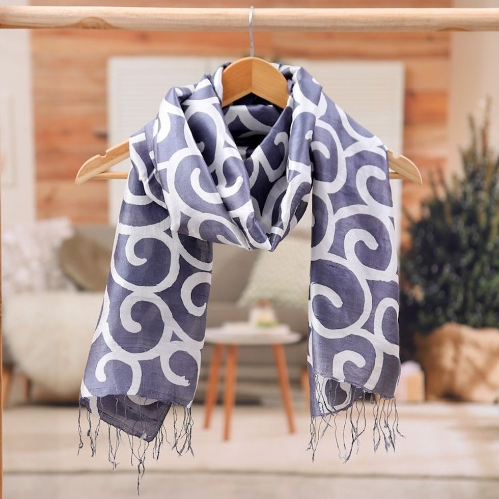 Batik-Dyed Spiral-Patterned Grey and White 100 Silk Scarf 'Grey Thai Maze' Item ID: 2671646710