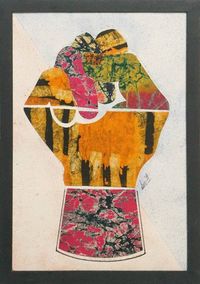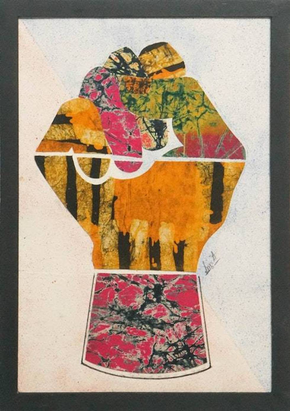"Ghanaian artist Emmanuel Atiemoh Yeboah arranges diverse batik textiles on this patchwork composition made to spread a message of self-empowerment. Proud of his heritage, the artisan carefully chooses the materials to use, cutting and setting them on a calico cloth, forming a strong fist that symbolizes resilience and courage."