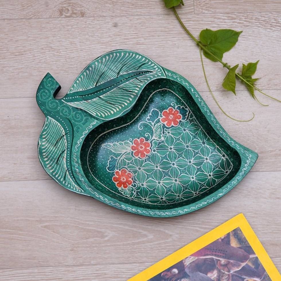 Batik Leaf-Shaped Green and Red Pule Wood Decorative Plate 'Truntum Foliage' Item ID: 2671670841