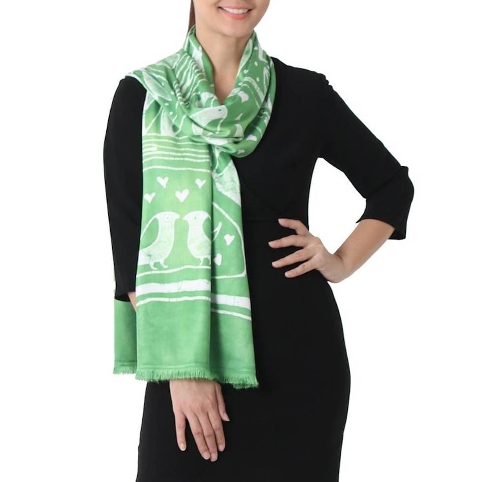 Batik Painted Bird Rayon Scarf in Lime from Thailand 'Bird Home in Lime' Item ID: 2671801203