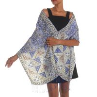 Batik Silk Shawl with Indigo Floral Motifs from Bali 'Orchid Temple in Indigo' Item ID: 2671733631