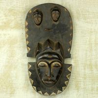 "Of Baule origin, this replica wall mask testifies to Eva Asantewa Amakye's wood carving skills. The Baule people of Ivory Coast are a community within the Akan people and are renowned for their carving traditions. This handsome sese wood African mask receives applications of clay for an aged look, and the tall headdress depicts twin faces."