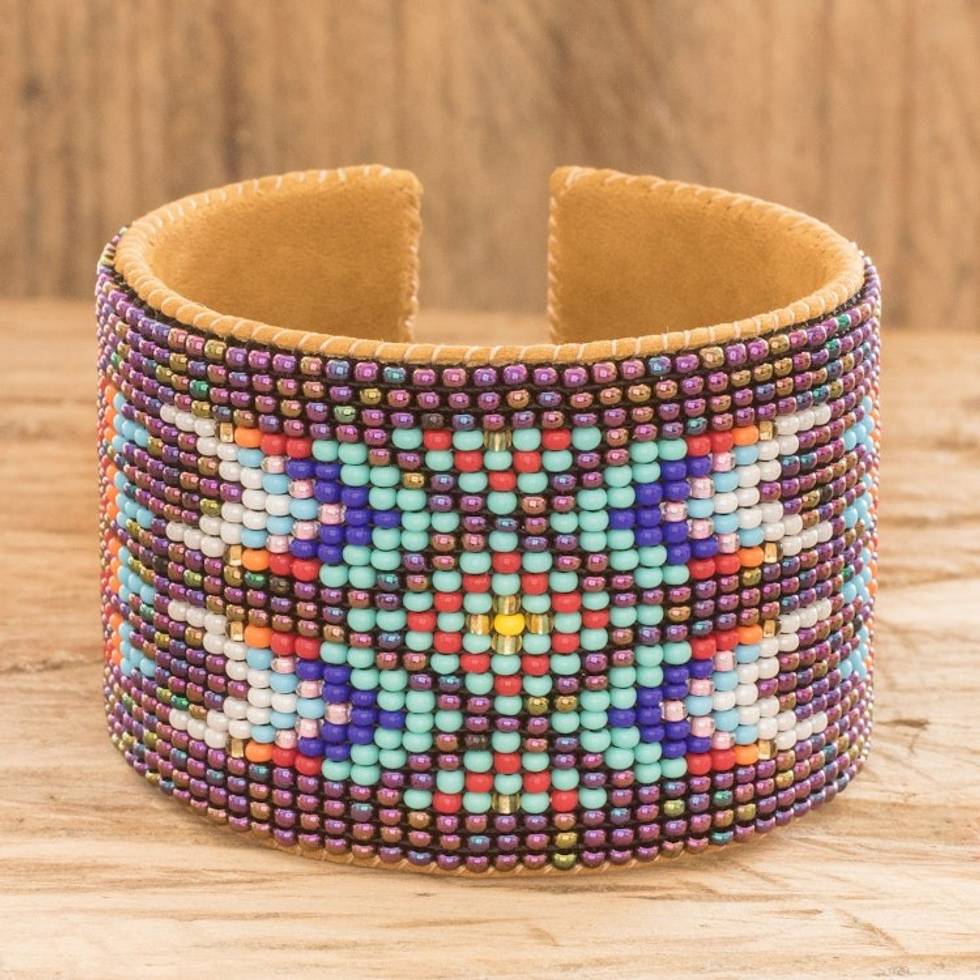 Beaded Leather and Suede Cuff Bracelet Handmade in Guatemala 'Ancestral Patterns' Item ID: 2669923621