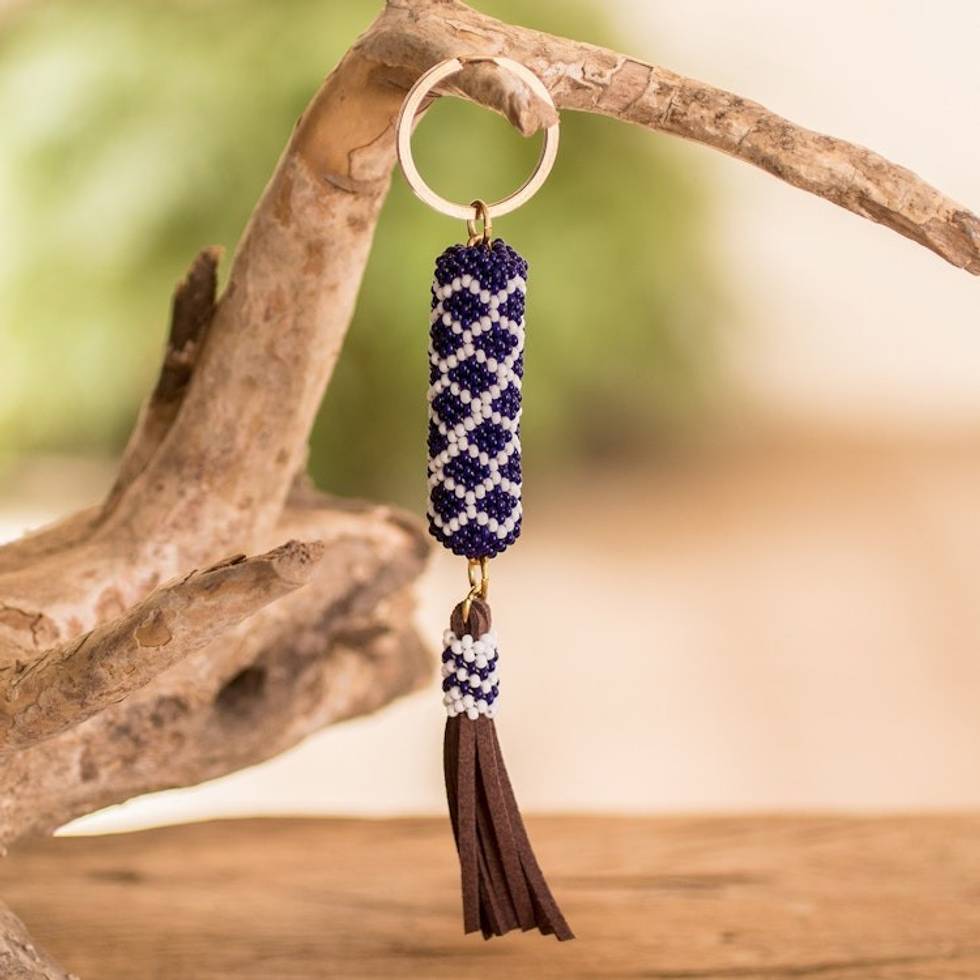 Beaded Leather Keychain and Bag Charm Handmade in Guatemala 'Diamond Blue' Item ID: 2671626600