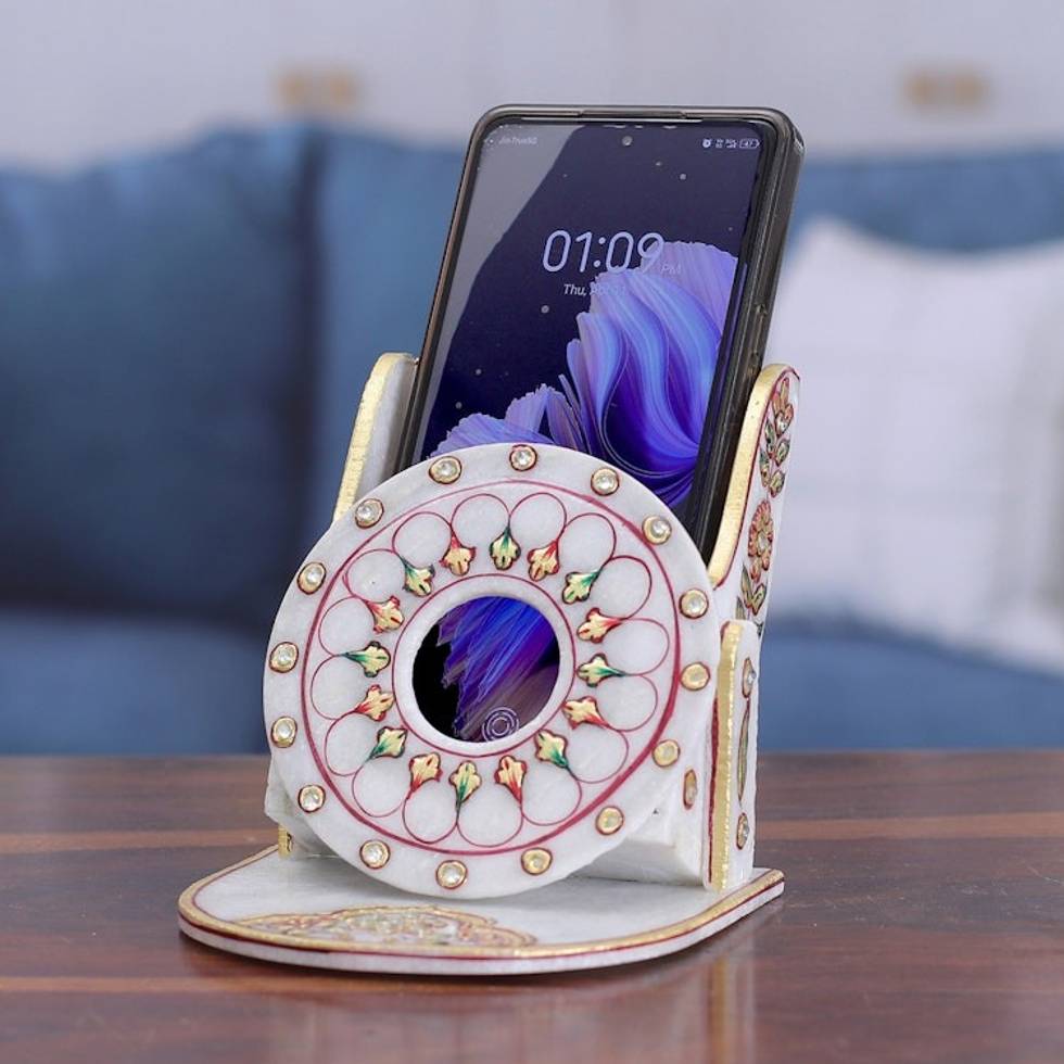 Beaded Marble Phone Holder with Hand-Painted Floral Motifs 'Floral Aura' Item ID: 2671781762