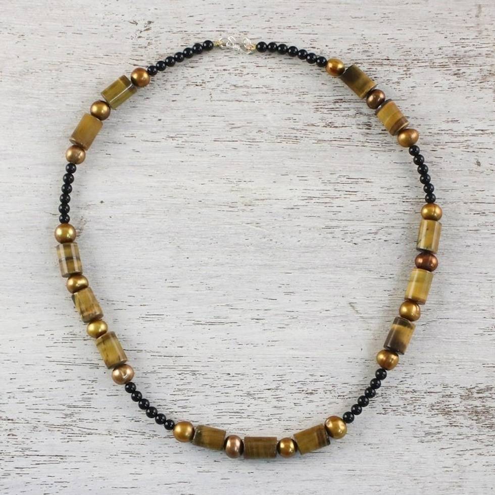 Beaded Onyx and Tiger's Eye Necklace 'Honey Bamboo' Item ID: 2671803106