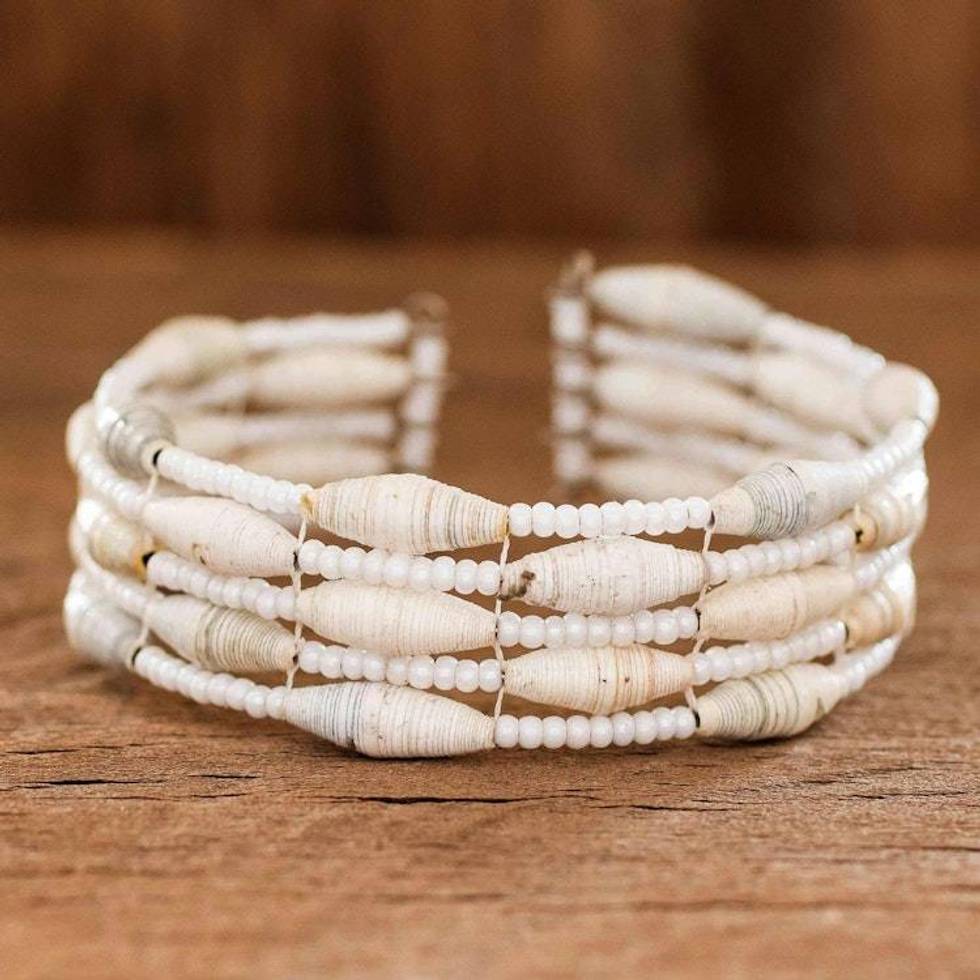 Beaded Recycled Paper Cuff Bracelet 'Nature of Life in White' Item ID: 2676659601