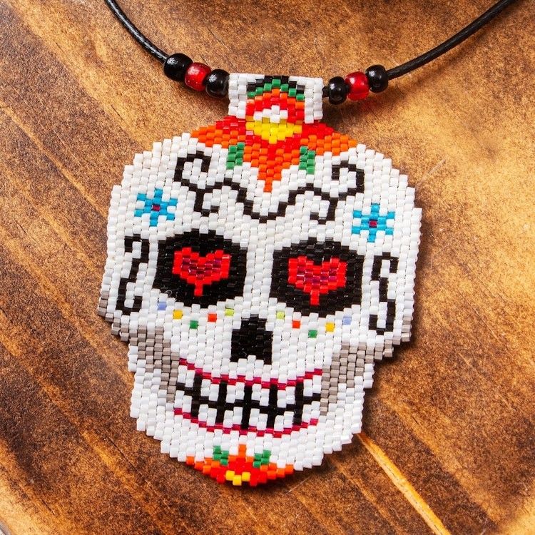 Beadwork Day of the Dead White Skull Huichol Necklace 'White Skeleton' Item ID: 2671807980