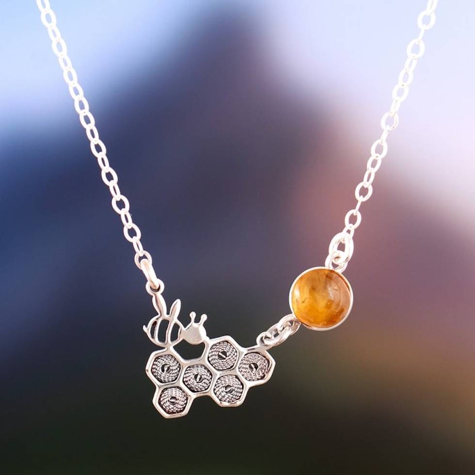 Bee and Honeycomb-Themed Citrine Silver Pendant Necklace 'Honey of Wisdom' Item ID: 2671698015
