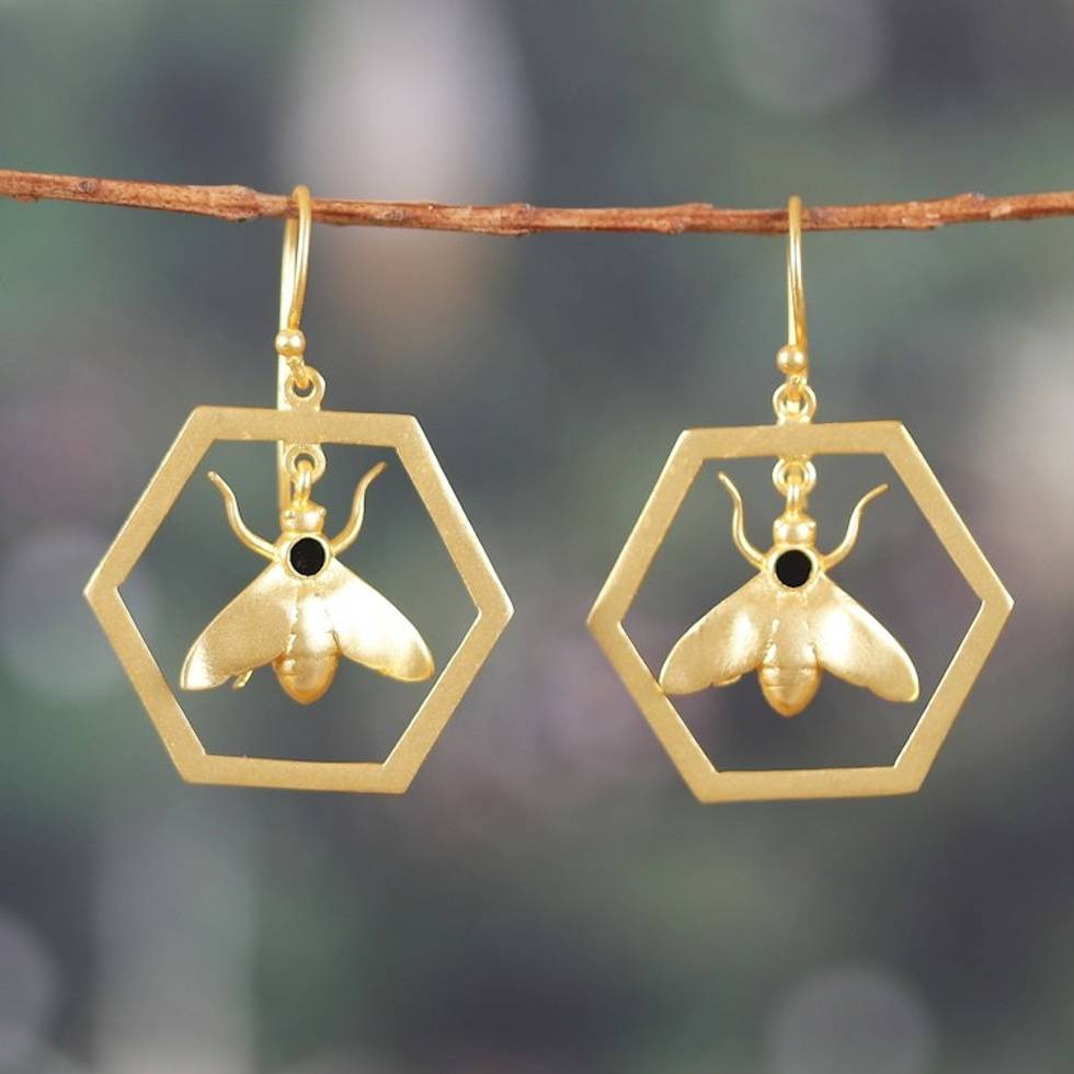 Bee-Themed High-Polished Brass Dangle Earrings from India 'Bee Golden' Item ID: 2671788327