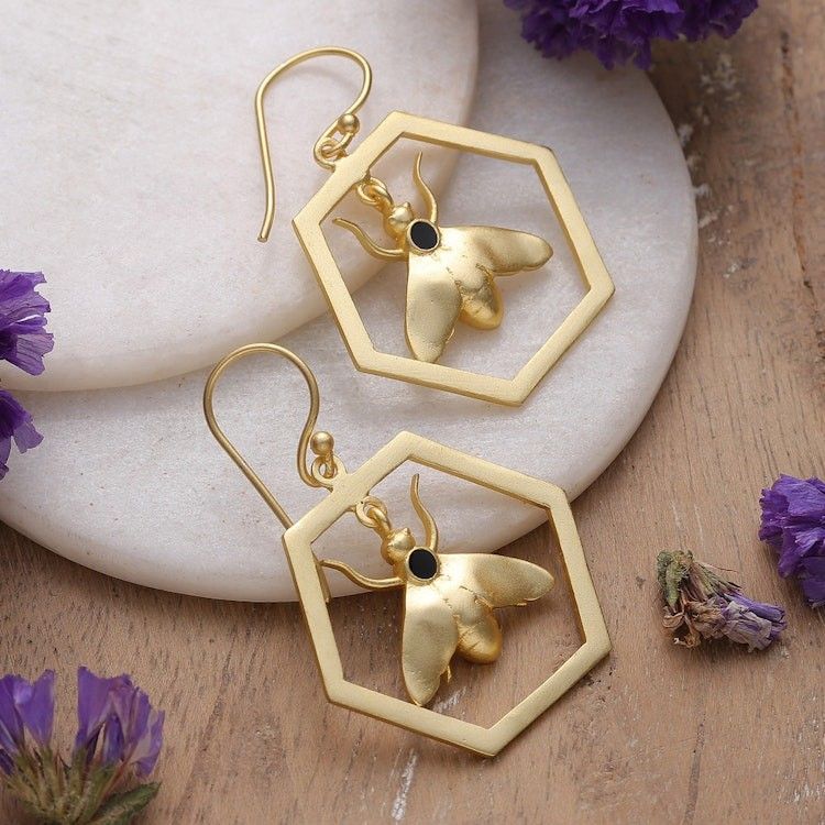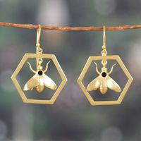 "Hardworking but always beautiful and graceful, these charming bees are here to teach a lesson of natural sophistication. Designer Anuva Baid of India creates these brass dangle earrings, whose high polish finish enriches the piece's illusion, depicting the bees entering their honeycomb-all in a sweet golden hue!"