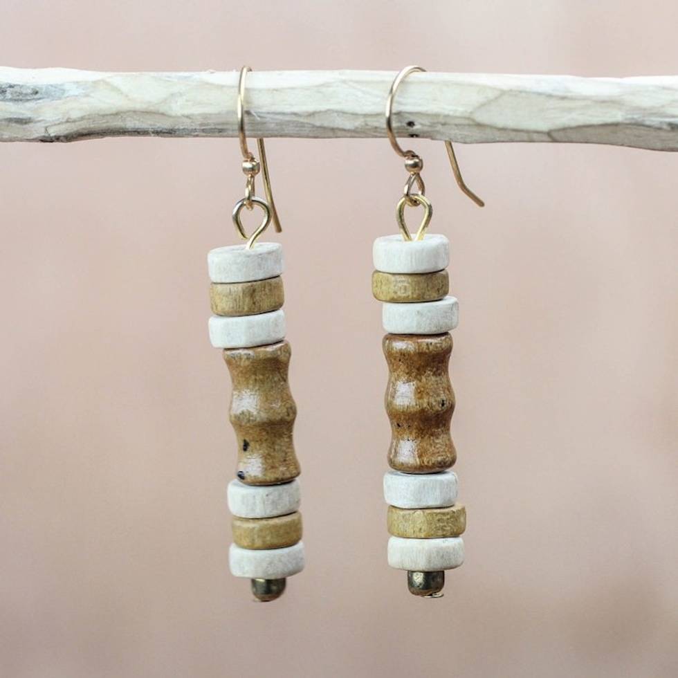 Beige and Cream Wood Cylindrical Bead Dangle Earrings 'Gazelle' Item ID: 2671806022